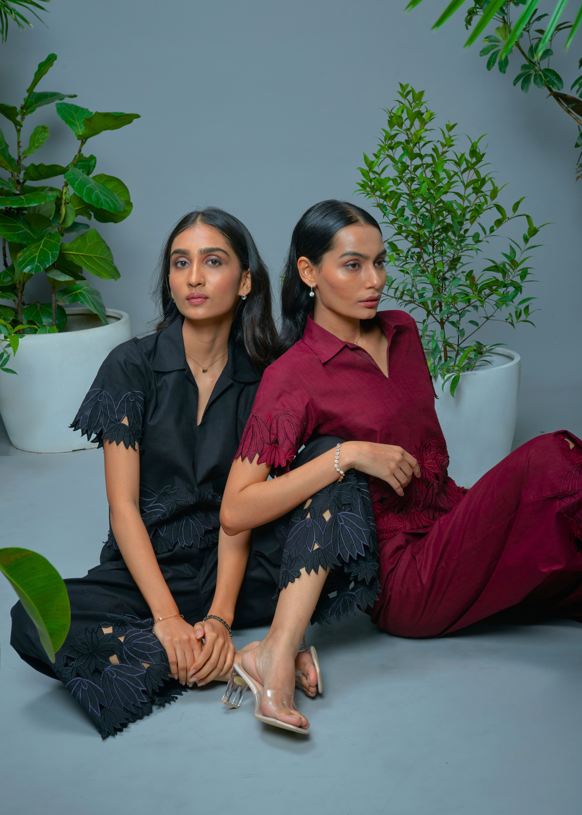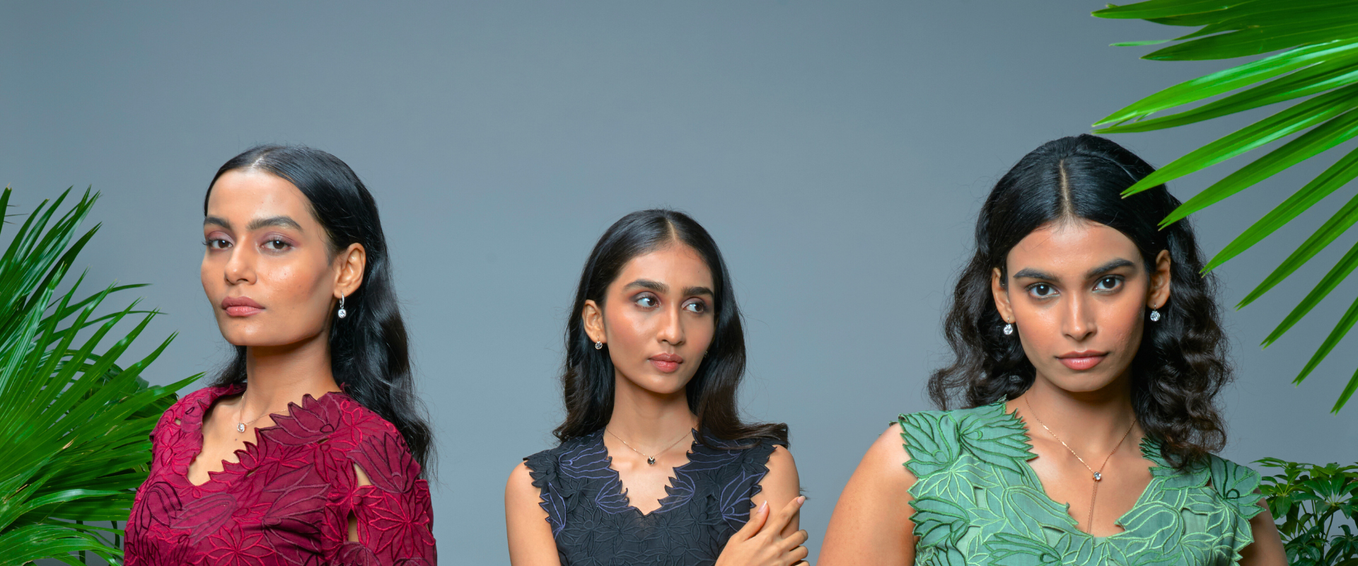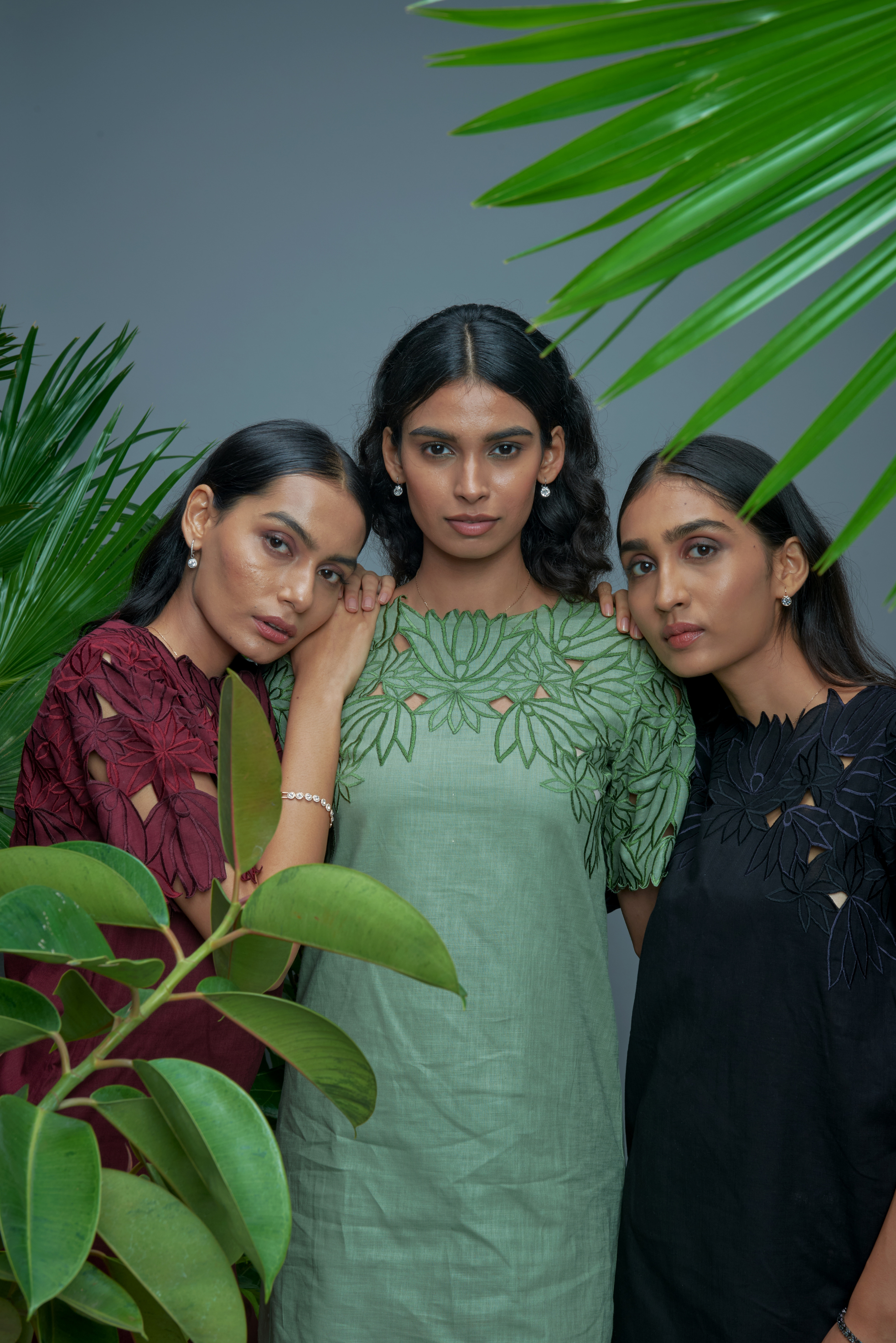 leaves, maroon evoking rich earth and deep blooms, and black as a bold, timeless contrast that anchors the collection.