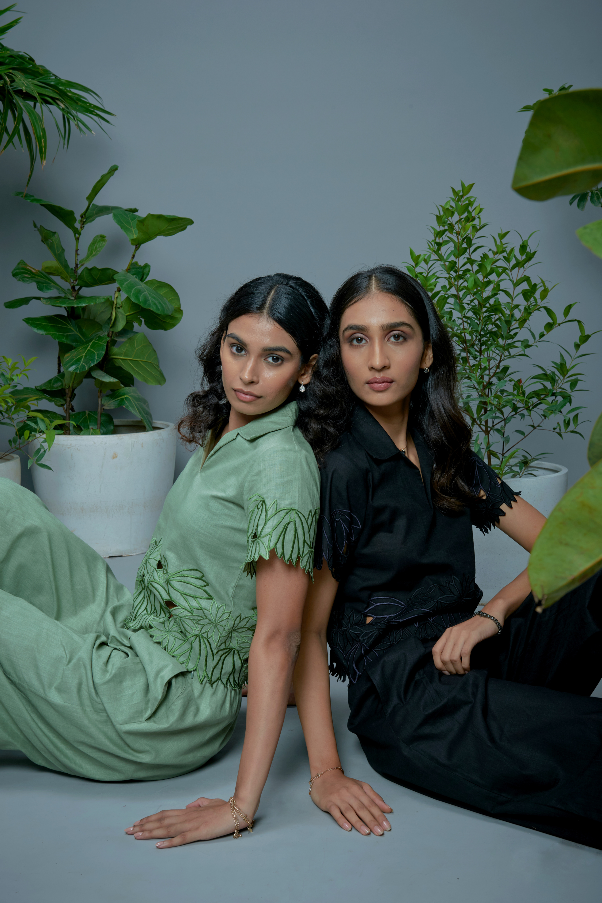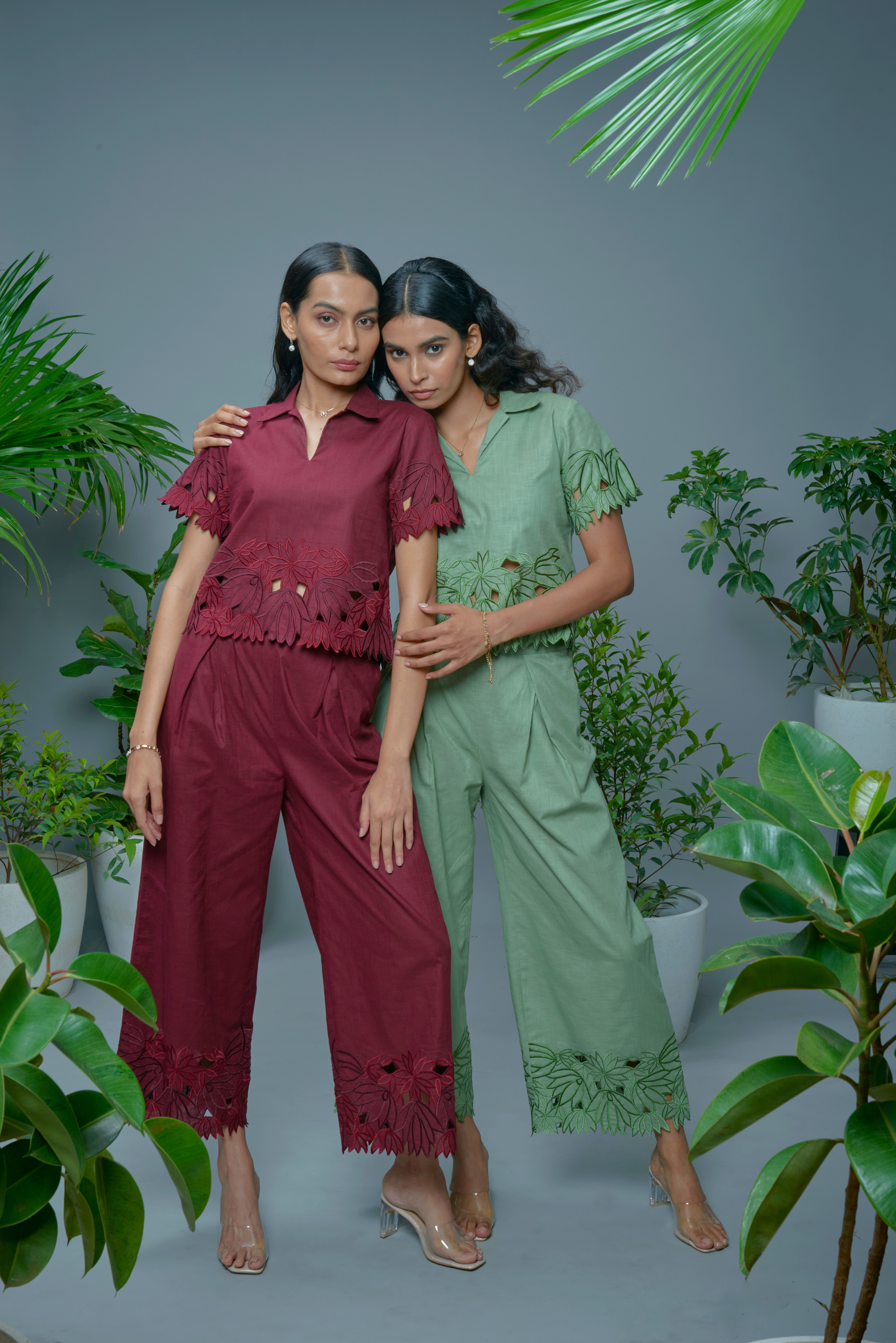 Drawing from the organic lines, layered textures, and gentle asymmetry of leaves, this collection interprets nature in an elevated, modern way. Each piece features individually crafted cutwork embroidery, inspired by natural motifs but reimagined through clean geometry and contemporary shapes. Crafted in lightweight cotton airweave, the garments drape softly and breathe easily, making them perfect for daytime while still versatile enough to dress up for elevated moments. The palette brings nature’s grounding tones to life: sage green reminiscent of dew-touched